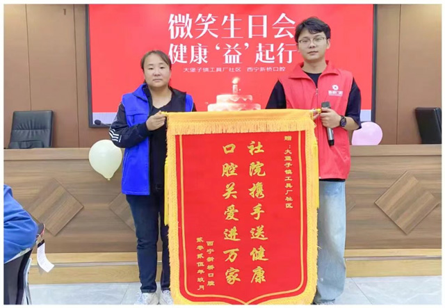 活动尾声,在全体人员齐唱生日歌、共送祝福的温馨氛围中,西宁新桥口腔向工具厂社区赠送了印有“社院携手送健康,口腔关爱进万家”的锦旗,以此感谢社区对公益健康事业的大力支持与紧密协作。