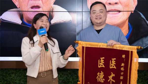 晚年生活更有滋味了!日前,在新桥口腔成都衣冠庙院区,专程从大邑赶来的章阿姨将一面满载谢意的锦旗亲手赠予新桥口腔医疗总监王锋医生,喜悦之情溢于言表:感谢新桥口腔,感谢王锋医生,让我又能畅快吃饭……